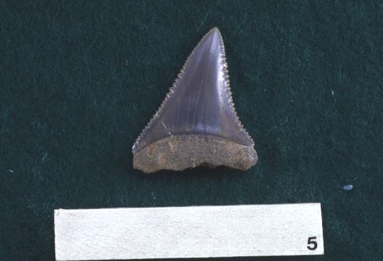 ホホジロザメは映画のジョーズのモデルとなった人食い鮫で、冷温帯〜熱帯の外洋域に生息している。体長は4~5m、最大9mにもなる。写真は名立層下部(今から約400万年前~300万年前)より発見されたホホジロザメの左上顎側歯であり、ホホジロザメの化石としては時代的に古いものである。サメの歯は何度も生え替るので、他の脊椎動物化石に比べ比較的化石になりやすく、江戸時代以前にも"天狗の爪"という名称で知られてきた。