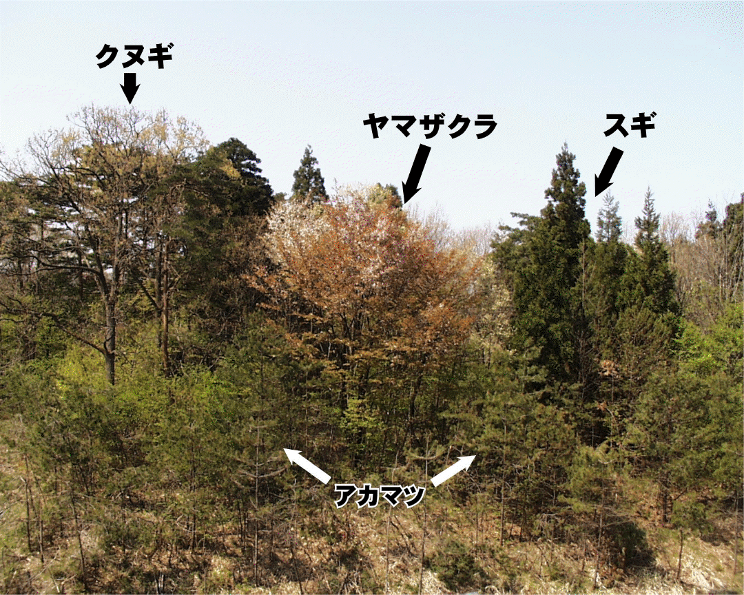 | これは上越教育大学構内の林の景観です。写真中に示した4種類の樹木に注目して、各時期の写真をご覧いただくと、季節変化がわかりやすいと思います。 |