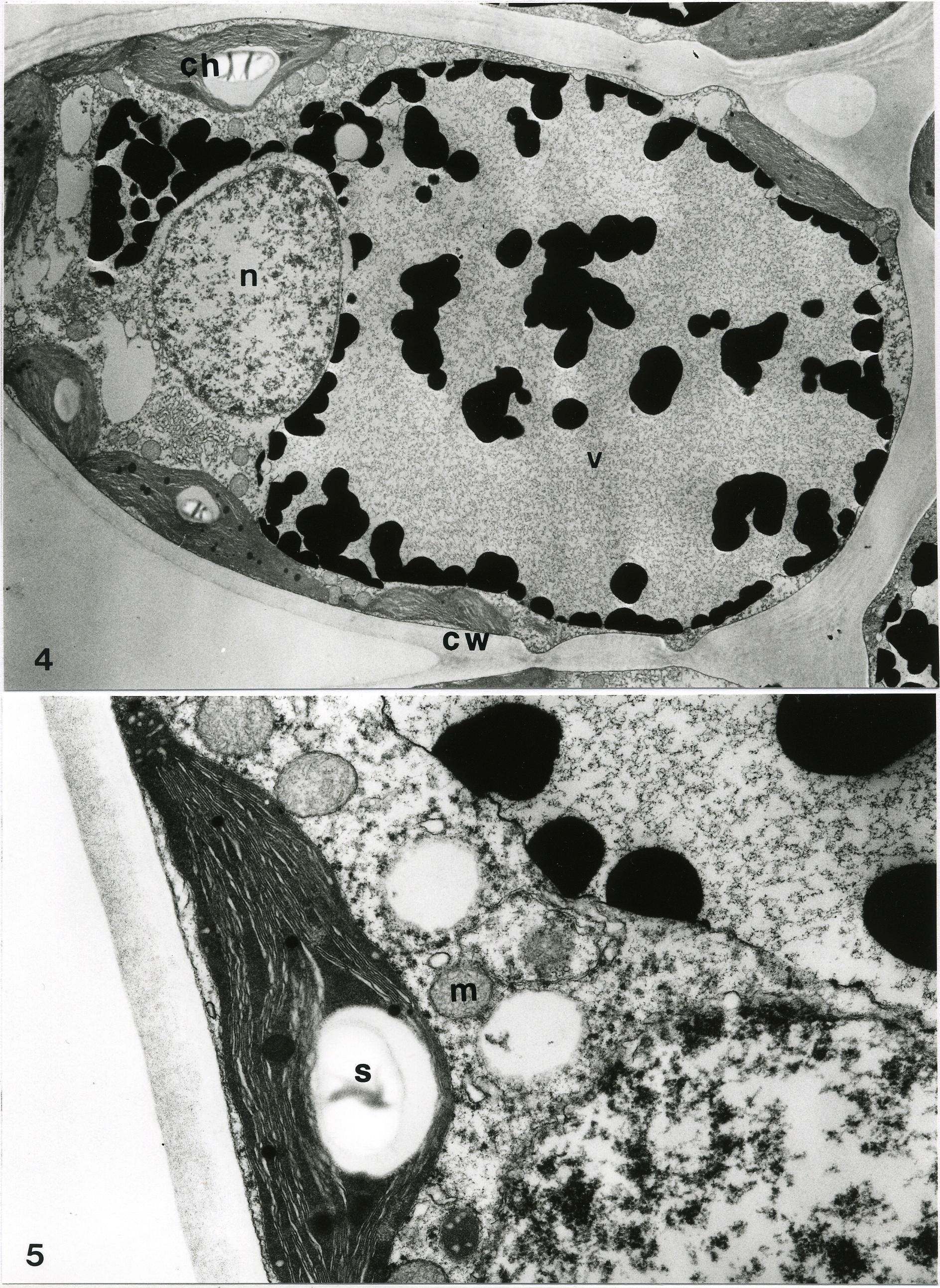 図 4 柵状組織の細胞のTEM像。細胞壁(cw)に沿って細胞質の層があり、そこに葉緑体(ch)、核(n)が見られる。細胞中央を占める液胞(v)内は電子密度の高い構造が含まれる。×4,200。 図5 柵状組織の細胞の拡大像。葉緑体内にはチラコイドが発達し、デンプン粒(s)が含まれる。葉緑体近傍にはミトコンドリア(m)が位置する。×16,800。